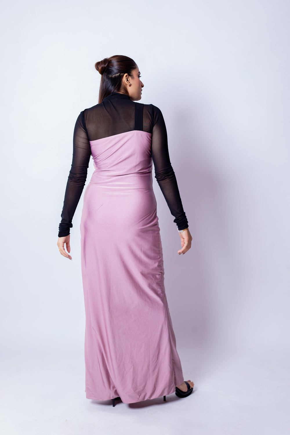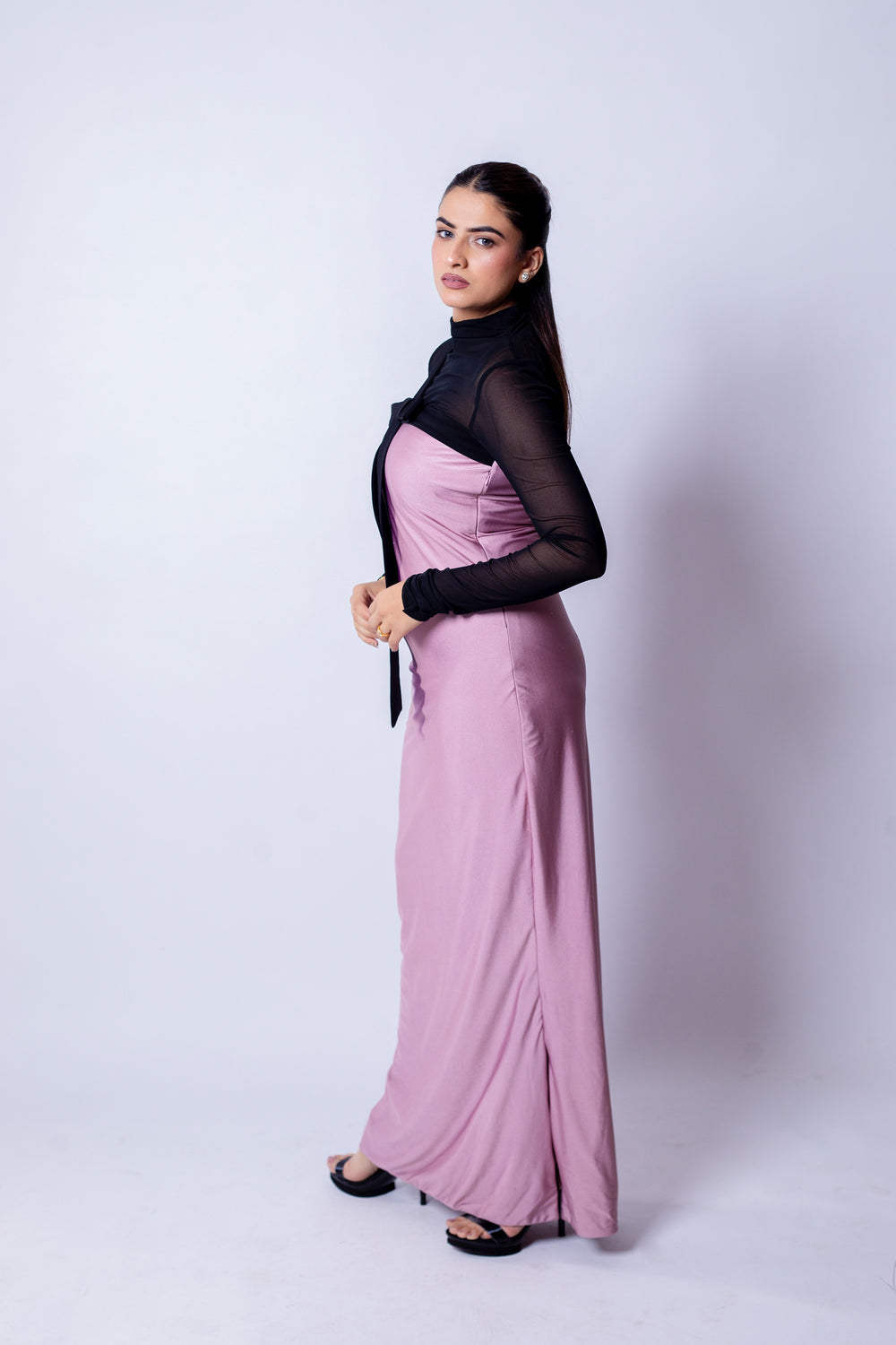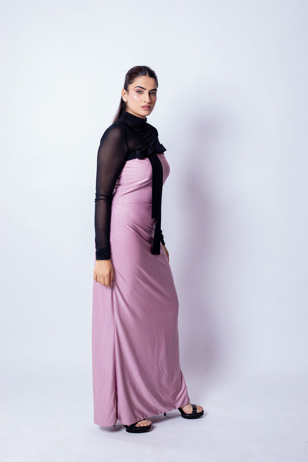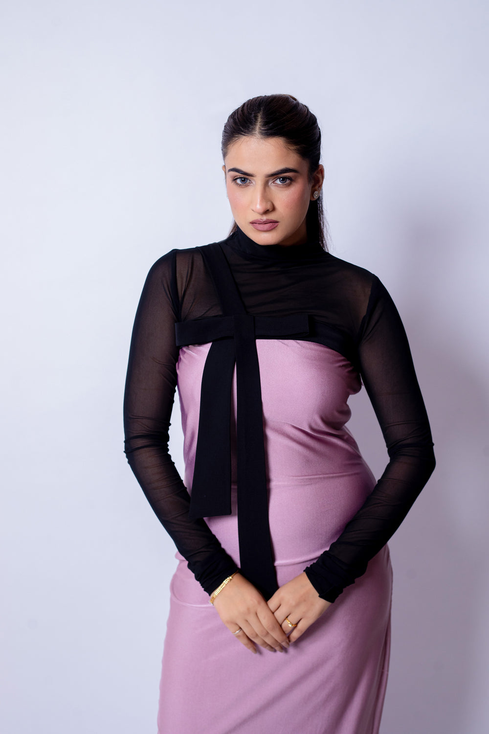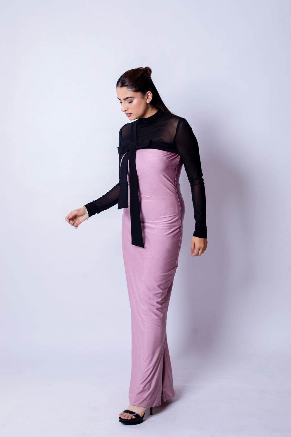 The Blush Bow Dress blends refined drama with timeless femininity. A sheer black high-neck overlay with full sleeves creates sophisticated depth, while the rich mauve bodice begins from the upper bust for a smooth, sculpted fit. A classic black bow at the neckline adds a charming focal point, balancing modern allure with vintage romance.
