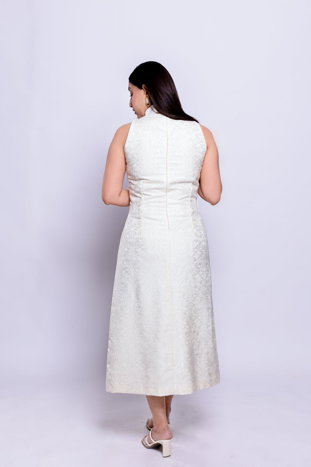 The Moonlit Dress combines rich texture with fluid elegance in a timeless A-line silhouette. Crafted in luxurious beige jacquard, the dress exudes refined sophistication through its intricate woven detail. A romantic georgette drape begins at one side of the bust, sweeps gracefully to the neckline, and falls beautifully across the front, adding movement, softness, and sculptural drama.