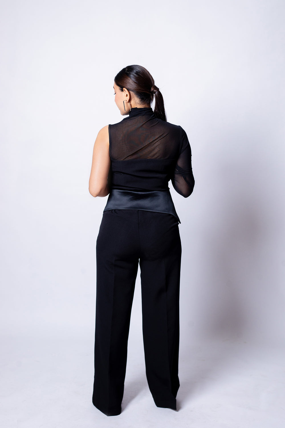 The Shadow Wrap Co-ord Set delivers power, polish, and bold sensuality in one striking ensemble. The high-neck, one-sleeve top is crafted in sheer black fabric for a dramatic, modern edge, layered over a sleek fitted tube top for structure and confident coverage. Paired with satin-matte pants featuring an innovative overlapping belt detail that contrasts glossy and matte finishes, this set blends fluid movement with architectural finesse.