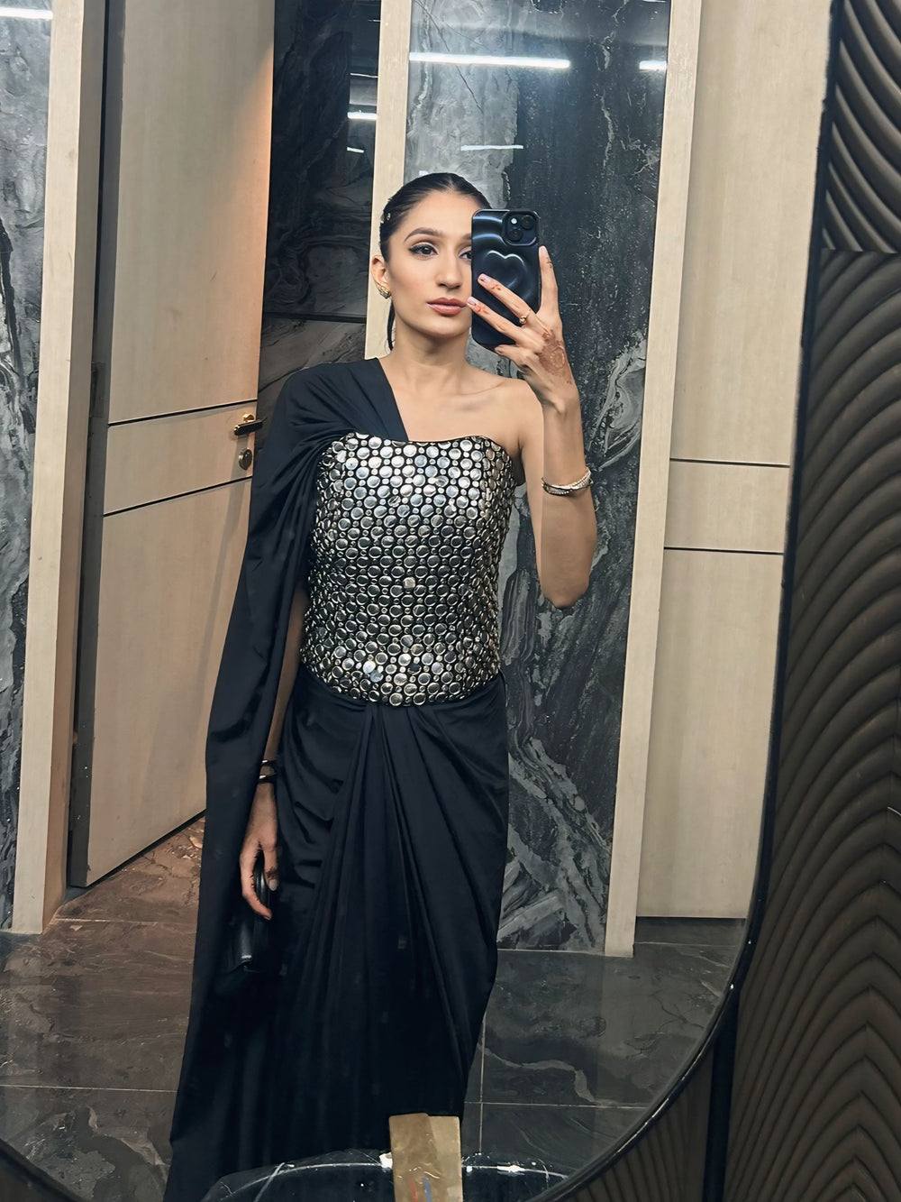 Fully embellished with reflective silver discs