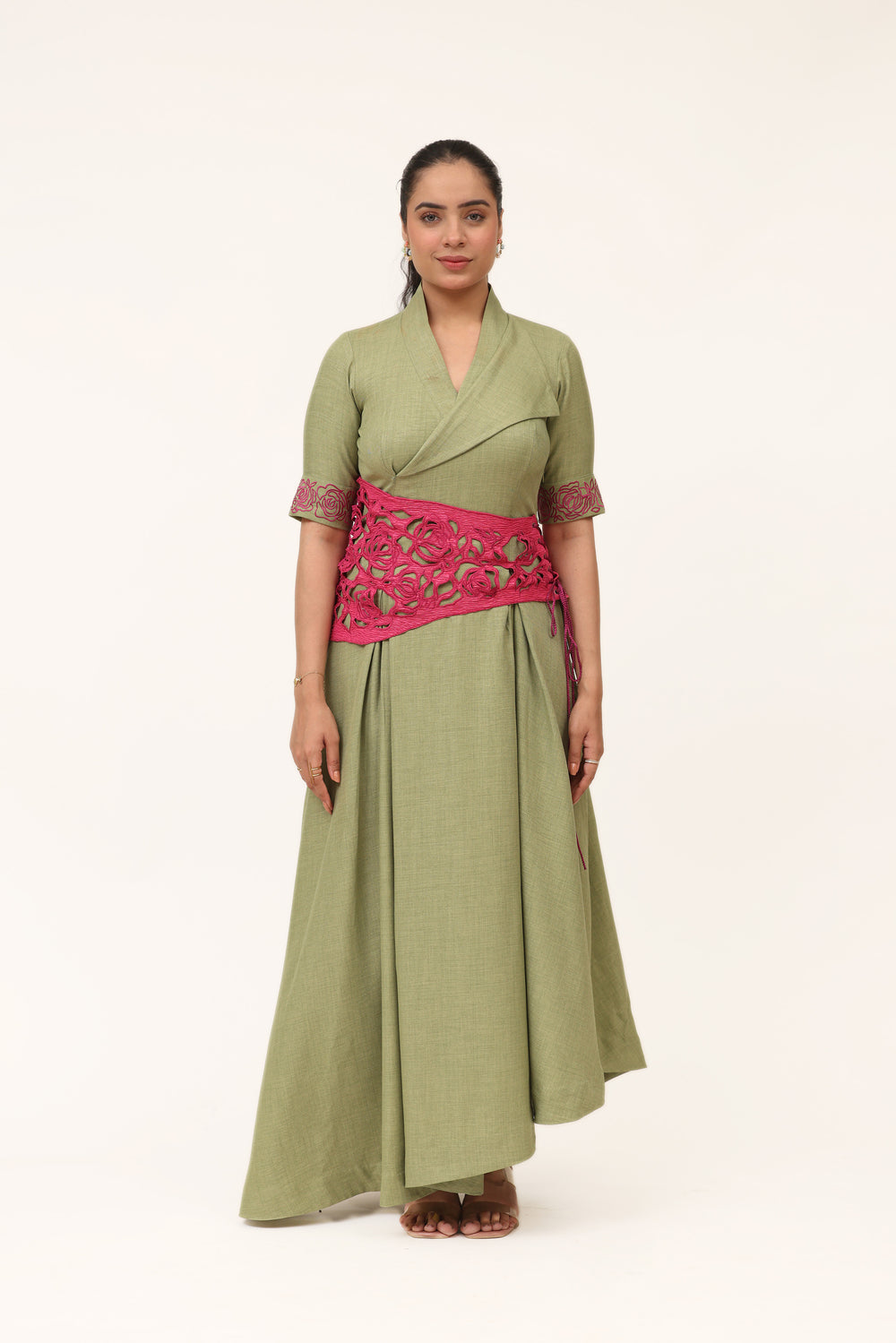The Whirl Of Petals Dress with Pink Cutwork Belt blends earthy refinement with a striking contemporary twist. Crafted in breathable cotton-linen, the dress features a flattering wrap-style bodice and V-neckline that accentuate the waist and frame. Delicate sleeve embroidery adds artisanal charm, while the extended single collar and asymmetrical hem introduce modern structure.